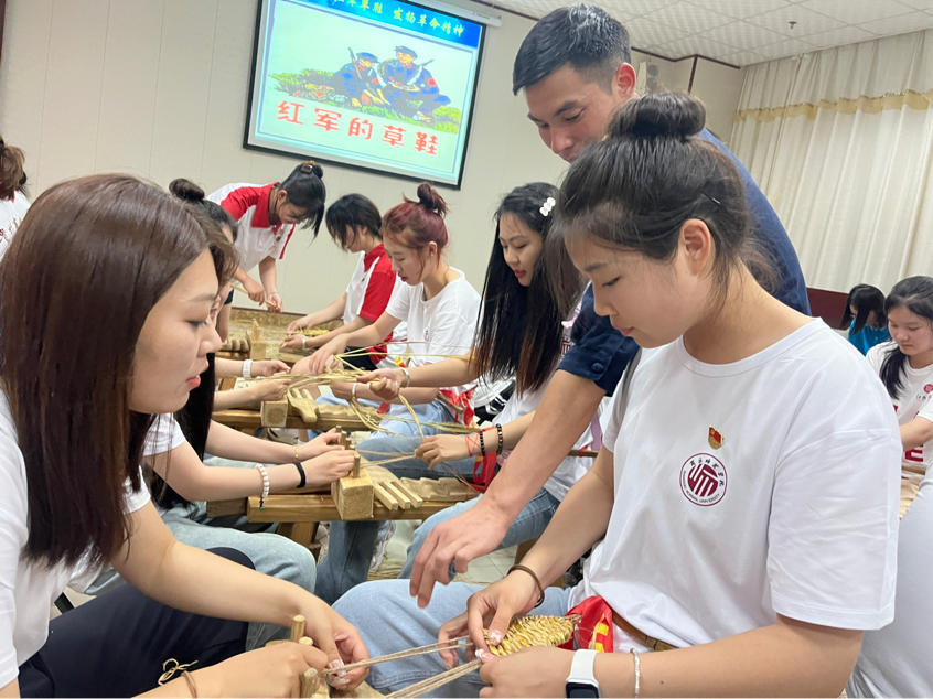 晚上,成员们参加以“永葆艰苦奋斗的优良作风”为主题的情景教学“学编红军草鞋”,基地教师刘小如用一曲朗朗上口的草鞋歌开启了这堂富有教育意义的草鞋编织教学课,他为学员们讲述了草鞋的历史故事,并邀请了两位师傅现场演示草鞋的制作方法。大家认真学习编草鞋步骤,编织、挽圈、压实……同学们也从中深刻领悟到红军艰苦卓绝的奋斗精神和爱国主义精神。