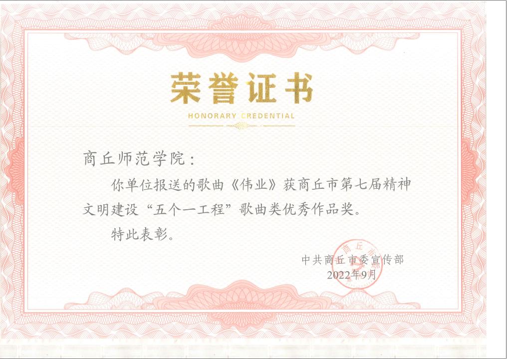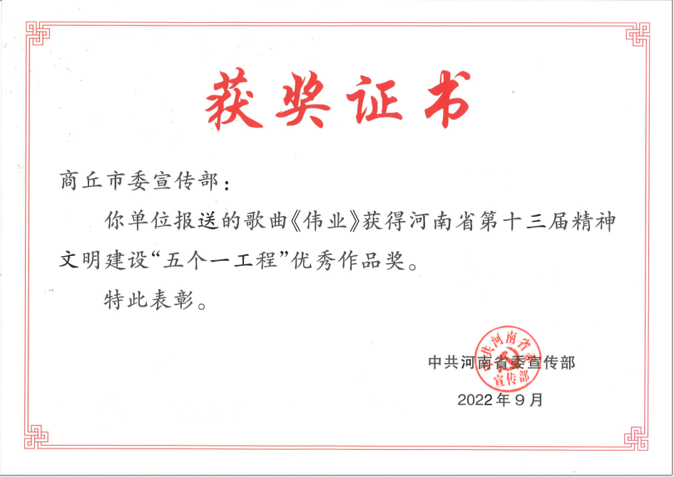 近期,河南省第十三届精神文明建设“五个一工程”奖评选揭晓,伟的国际1946bv官网副经理蒋修辉创作的歌曲《伟业》代表商丘市参选,荣获河南省第十三届精神文明建设“五个一工程”优秀作品奖。