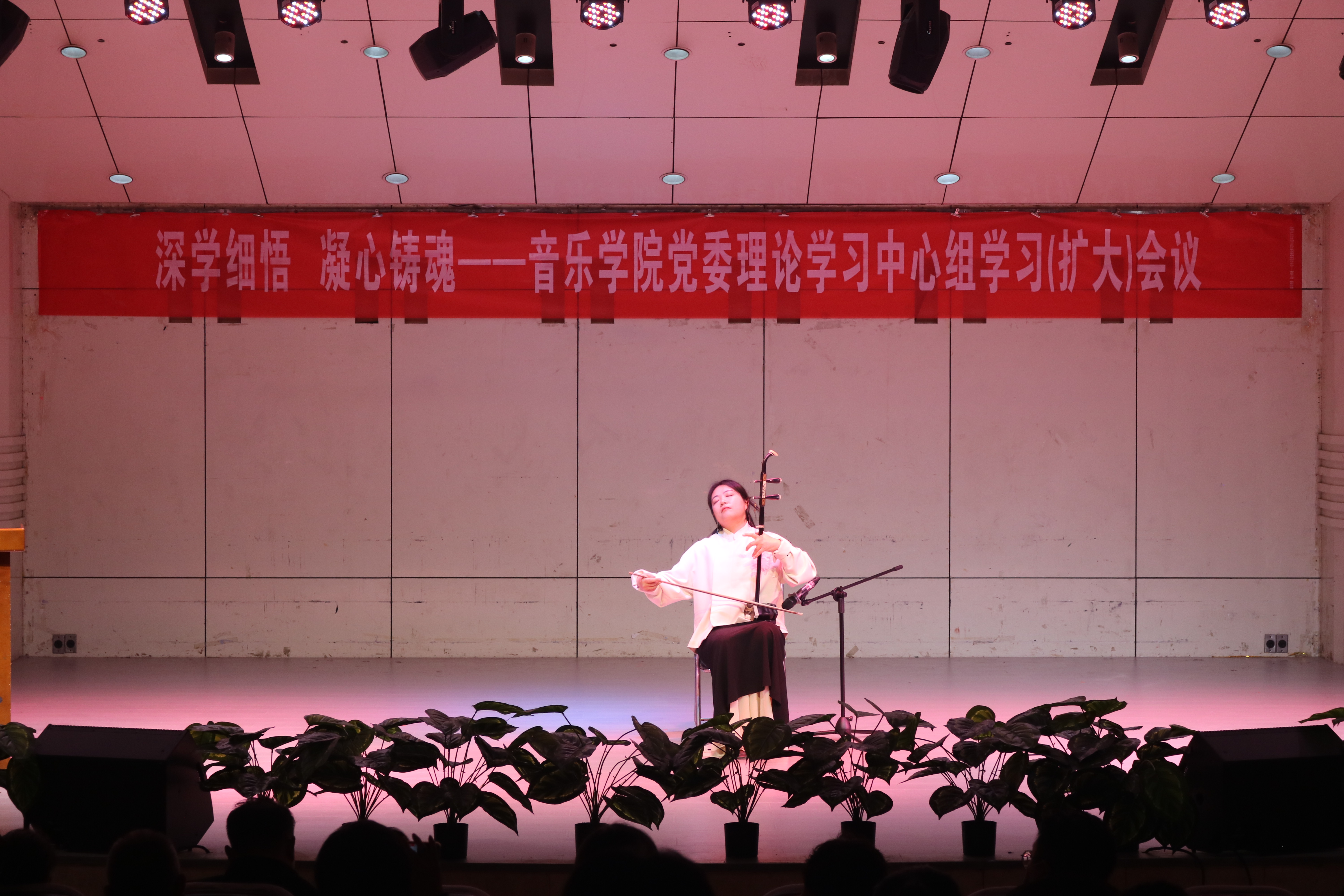 教师党员华磊、沈雪结合《鸿雁》《赛马》等经典乐曲演奏,阐释音乐作品中所蕴含的和谐、团结、爱国等价值理念,生动展现艺术与理论的深度融合。