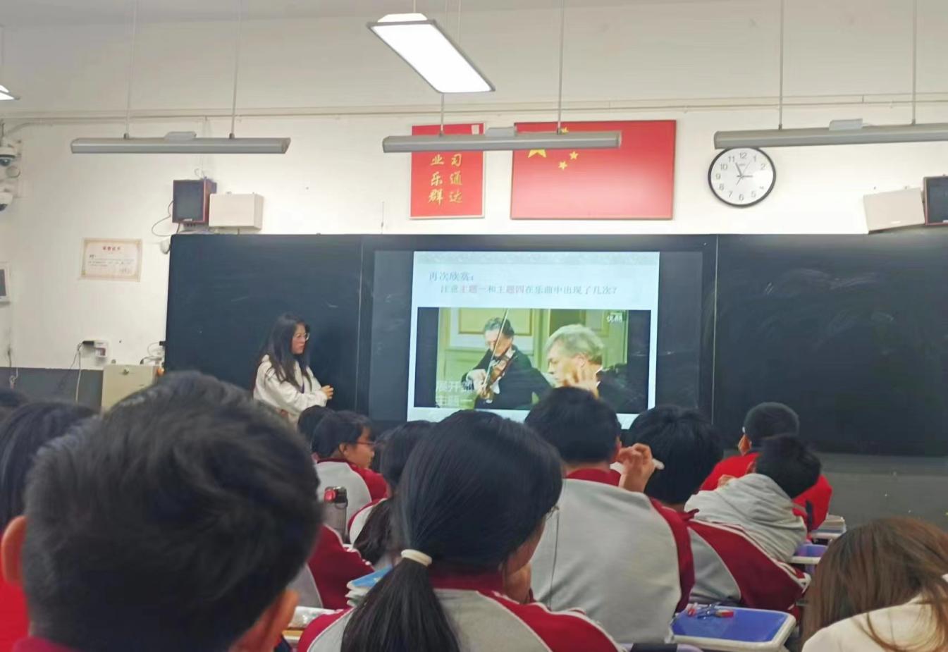 第四小组坊员程涵笑和封雨分别在八年级20班、19班教授了音乐课——《G大调弦乐小夜曲》,其他坊员听课。两节课的课堂气氛非常活跃,员工能够认真聆听学习,积极参与课堂。经过一节课的学习,同学们不仅学习到了奏鸣曲式等音乐知识,还从莫扎特的音乐中体会到了震撼、高贵和优雅。