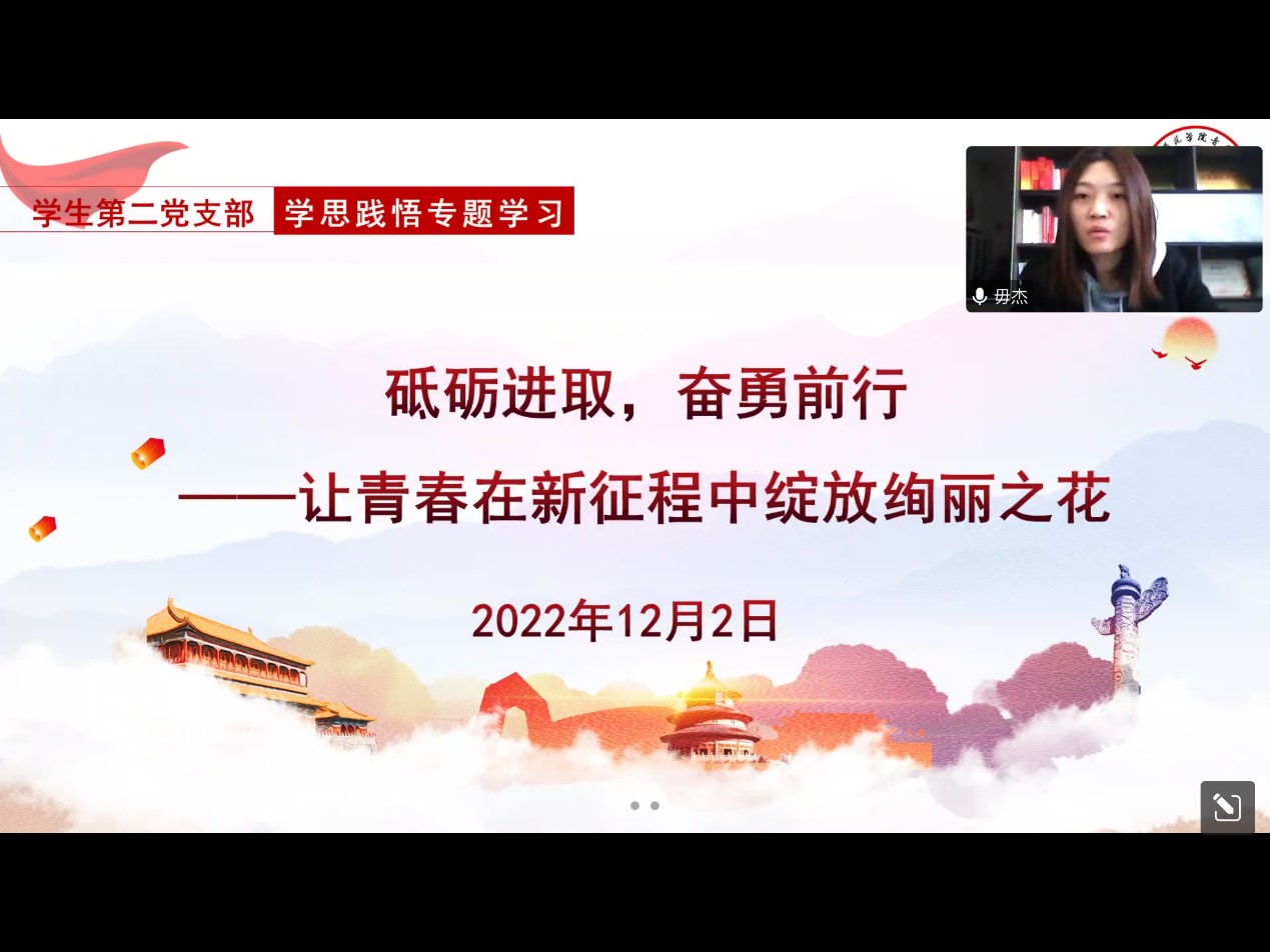 此次党的二十大精神宣讲活动,使支部党员深刻了解现阶段国家发展形势,感受到了新时代下青年的责任与使命,意识到应当增强自身本领,提高综合素质,将自己融入时代的洪流,以民族复兴为己任,将有限的青春投入到无限地奋斗中去,争做有理想、敢担当、能吃苦、肯奋斗的新时代好青年。