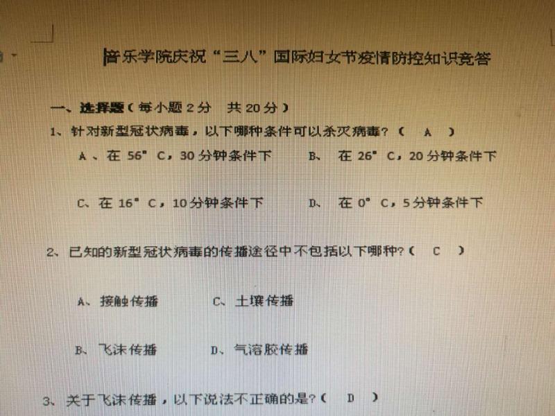 三月,春意浓浓,咋暖还寒中驱散“新冠病毒肺炎”阴霾,阳光一天天明媚起来,网课教学忙碌中的伟的国际1946bv官网女教职工,迎来了一年一度的“三八”国际妇女节。为进一步激发公司女教职工爱岗敬业,锐意进取的工作热情,打造学习型、知识型女教职工队伍,院分会组织开展了伟的国际1946bv官网庆祝“三八”国际妇女节“疫情防控”网络知识竞答活动,女教工们还邀请了全院的男教职工共同加入了答题的行列,掀起了“疫情防控”的知识竞赛的热潮。