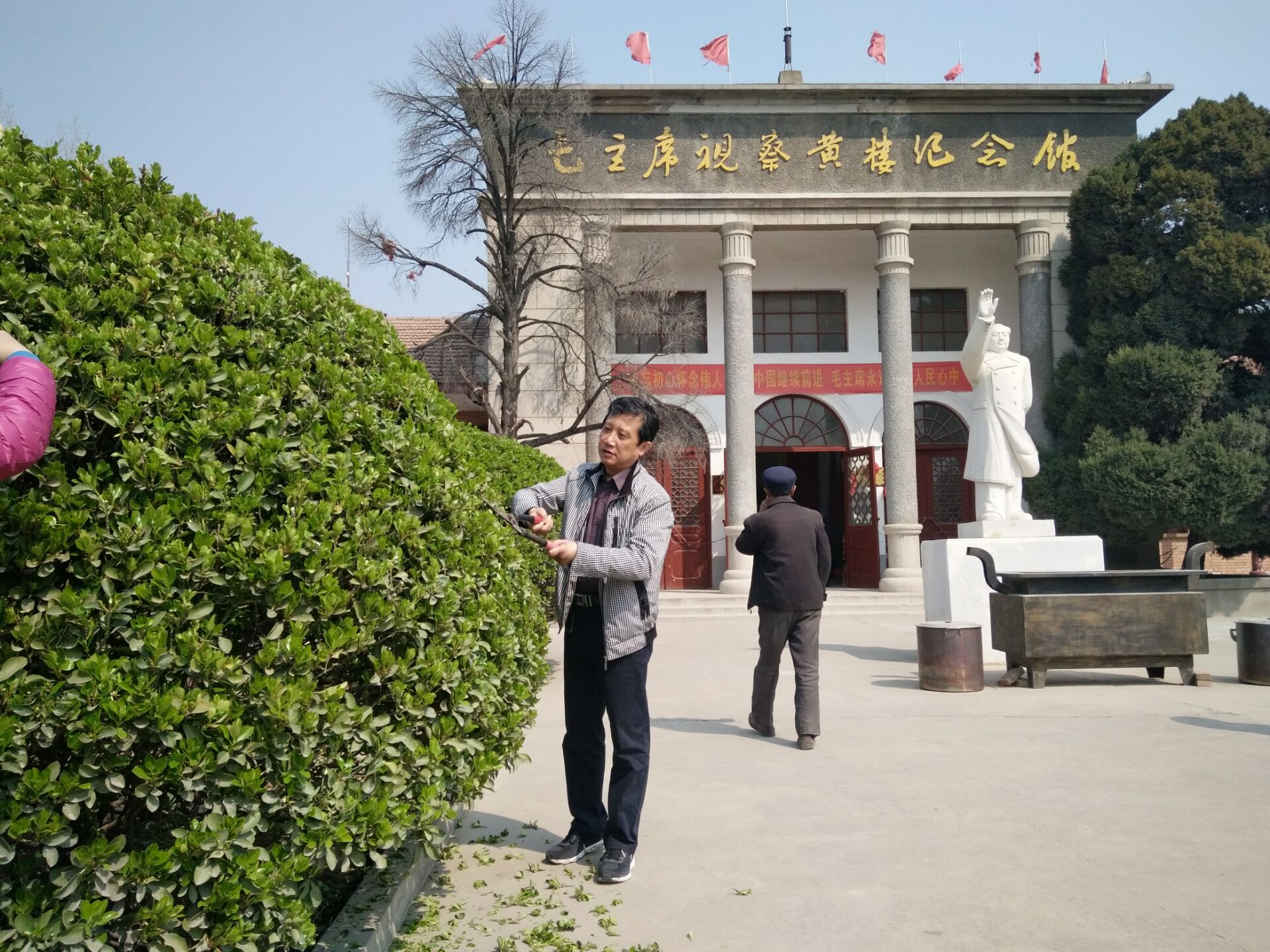 参观完毕后,在杨新庆书记、唐丽副书记、刘辉老师的带领下,师生一起修剪冬青树、打扫卫生。大家轮番上阵、热火朝天,纪念馆很快焕然一新。