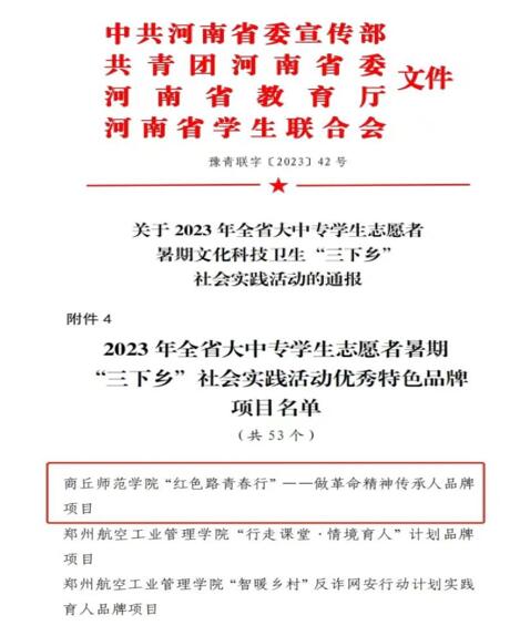近日,团省委下发了《关于2023年全省大中专员工志愿者暑期文化科技卫生“三下乡”社会实践活动的通报》,表彰了积极组织、指导和参与社会实践活动并取得优秀成果的有关团组织、实践团队、品牌项目及个人,公司“红色路青春行”--做革命精神传承人品牌项目获评河南省暑期“三下乡”实践活动优秀特色品牌项目。