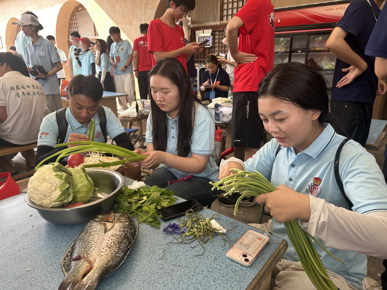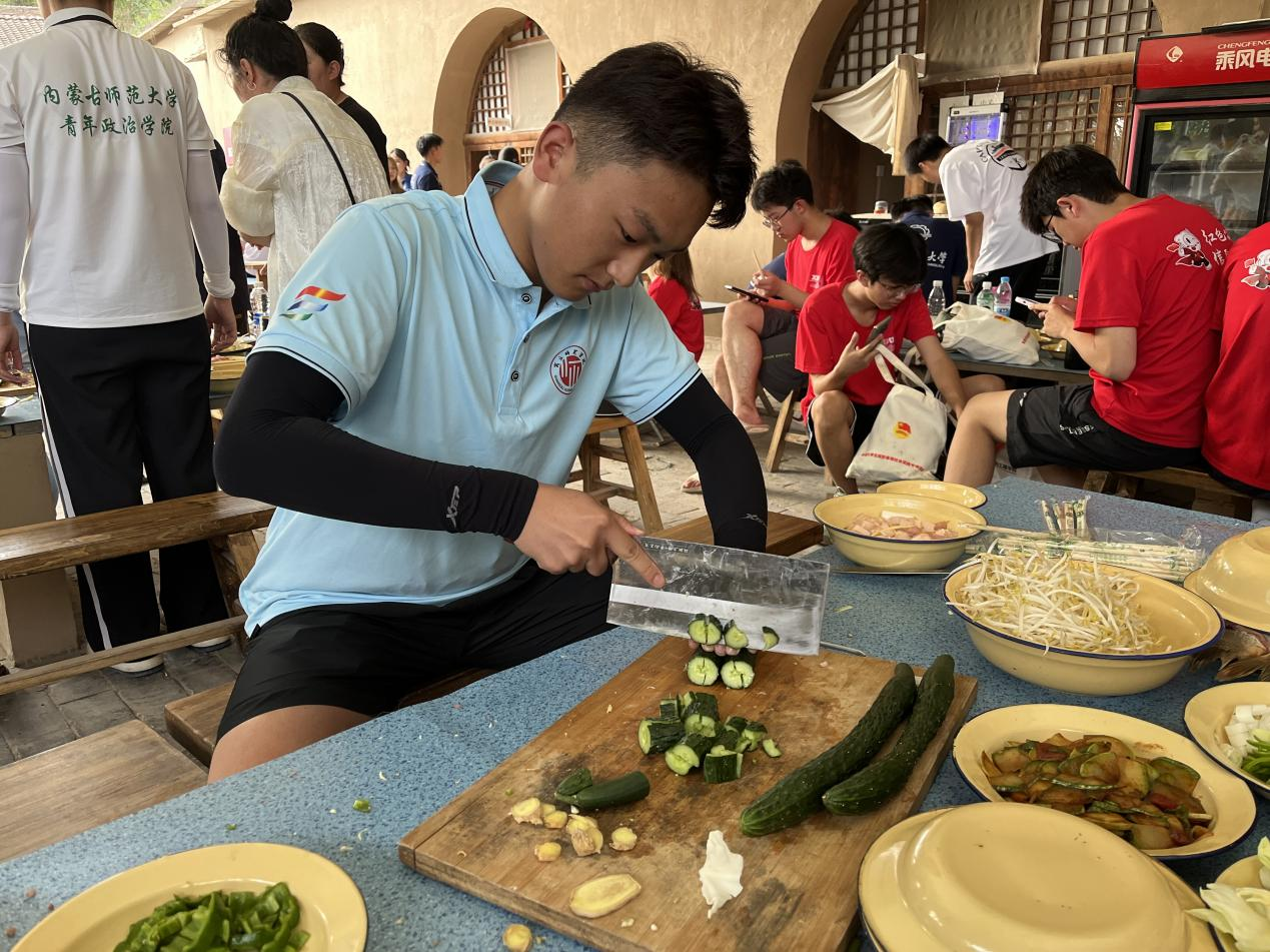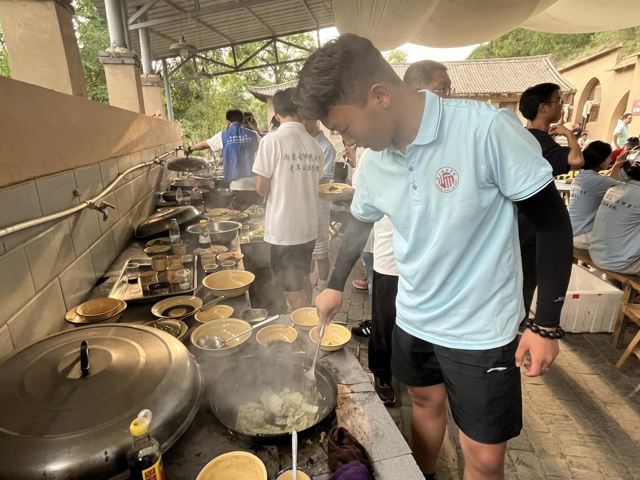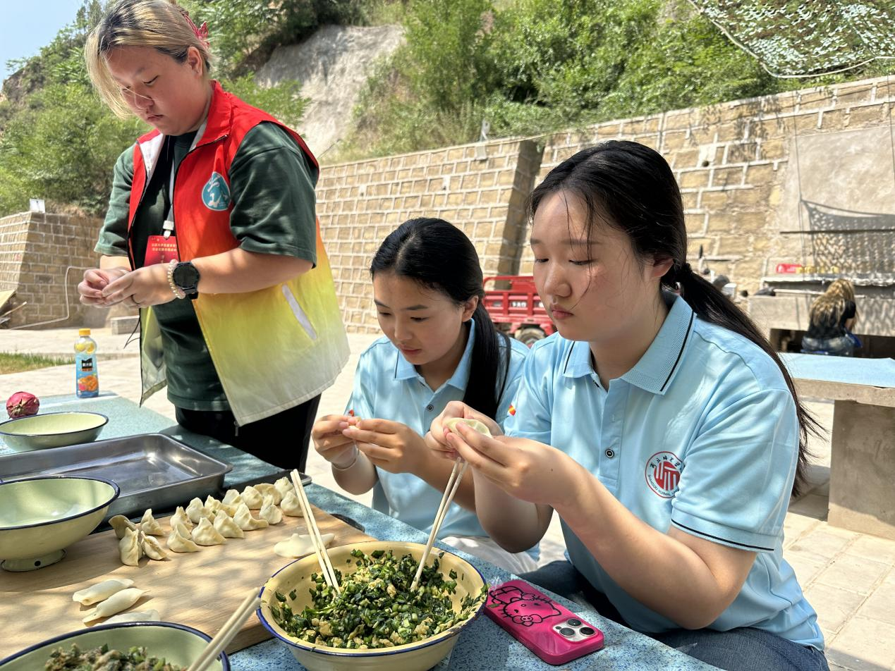 实践团成员居住在中国女子大学旧址的窑洞,基地为最大程度保护窑洞的完整性,只简单摆放4个架子床,供8名成员入住,黄土覆地,木椅纸窗,朴素简单的屋内构造重现了革命时期的居住环境。在这里,老一辈革命家们提出了“自给自足,丰衣足食”的口号,实践团成员积极参加“自己动手,丰衣足食”体验活动。同学们利用基地提供的材料及设施,与哈尔滨工业大学、西安电子科技大学实践团共同制作晚餐,与福州外语外贸公司共同包饺子。大家明确分工,择菜、清洗、煮饭、炒菜,用极具当地特色的灶台做出美味佳肴,真正在土窑洞中体验延安时期的艰苦岁月。