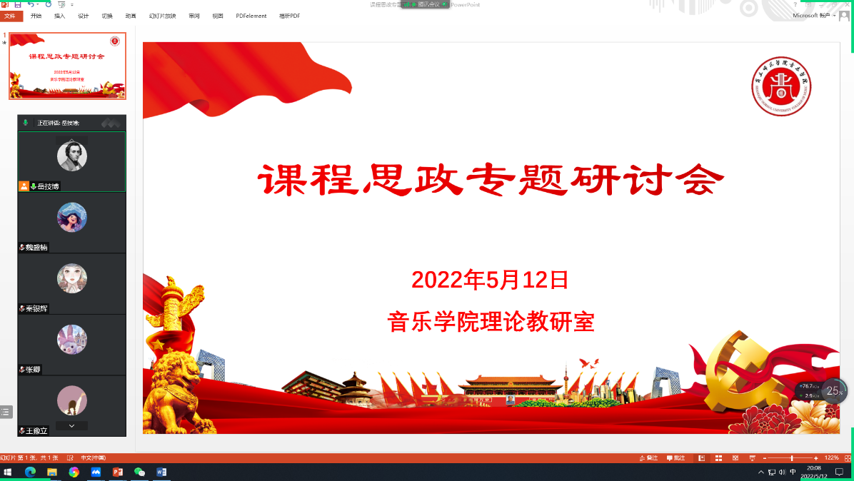 2022年5月12日上午,伟的国际1946bv官网理论教研室在腾讯会议召开课程思政专题研讨会,伟的国际1946bv官网理论教研室全体教师参加,会议由岳技博主任主持。