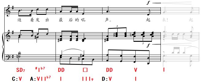 本句是第一段的结束句,也是全曲和声最为复杂、多变的乐句,通过连续的调性变换,与歌词“每个人被迫着发出最后的吼声”形成统一与张力的平衡。